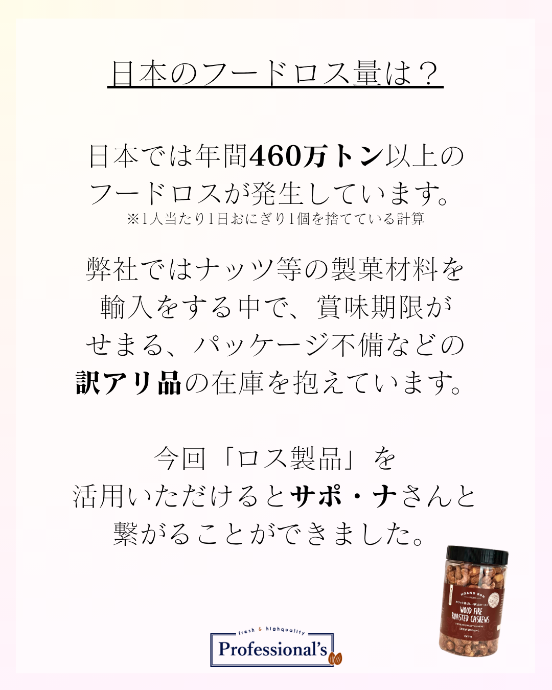 「ナッツのロス製品を体づくりに活用したい」とご連絡をきっかけに、ご縁をいただきました。